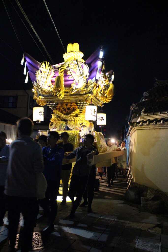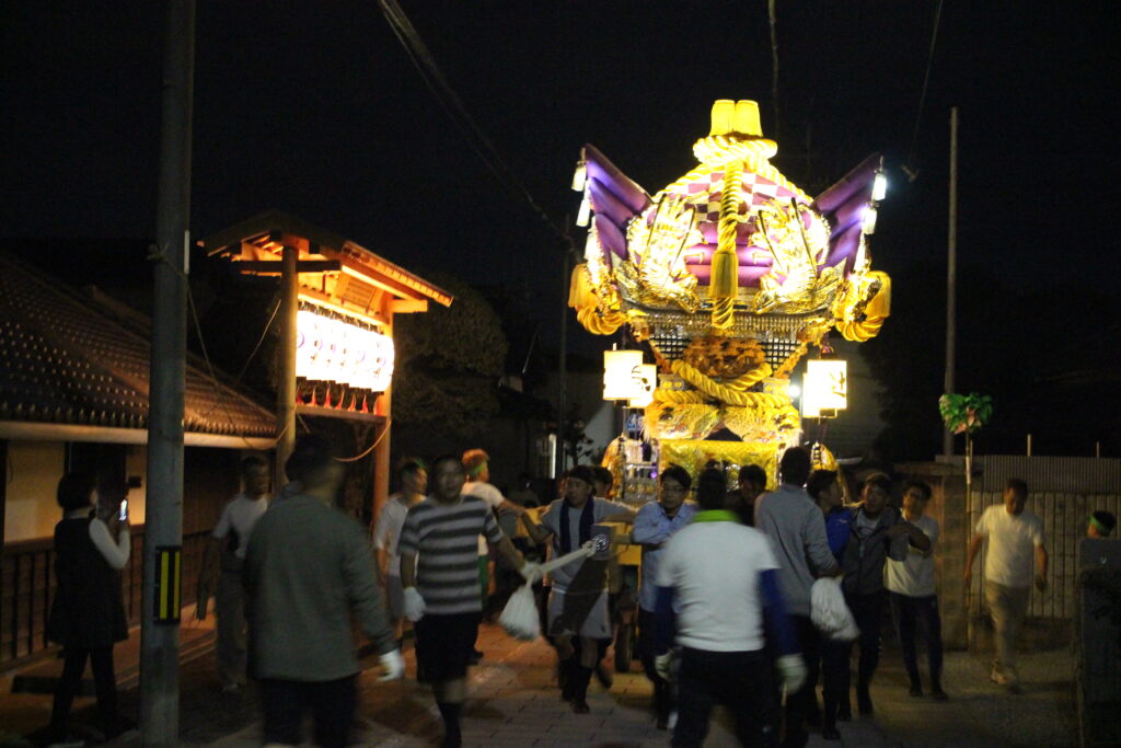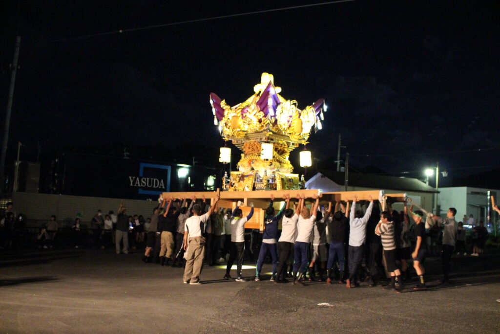 肩合わせ②25’10.9 文化 2025.10.112025.10.09 夜の20時より、2回目の肩合わせを行いました。上原青年団長の思いを松岡祭典委員長を中心に木方、棒端、消防団、青年団が力を合わせて、一つになろうとしています。 ▲屋台蔵から肩合わせの会場へ!! ▲旧道を。 ▲差し上げています!!