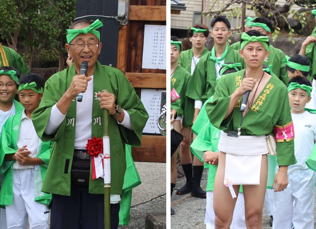 秋祭り(宵宮)①出立ち25’10.11 文化 2025.10.132025.10.11 秋祭りの宵宮(よいみや)が、昨日までの暑さに比べると、涼しい中で始まりました。まずは、田﨑区長の挨拶、上原青年団長の挨拶、そして、区長より前田木方長への拍子木の授与が、山口棒端長への棒端の授与が行われた。 ▲田崎区長(写真左)、上原青年団長(写真右)挨拶 ▲区長より前田木方長へ ▲区長より山口棒端長へ