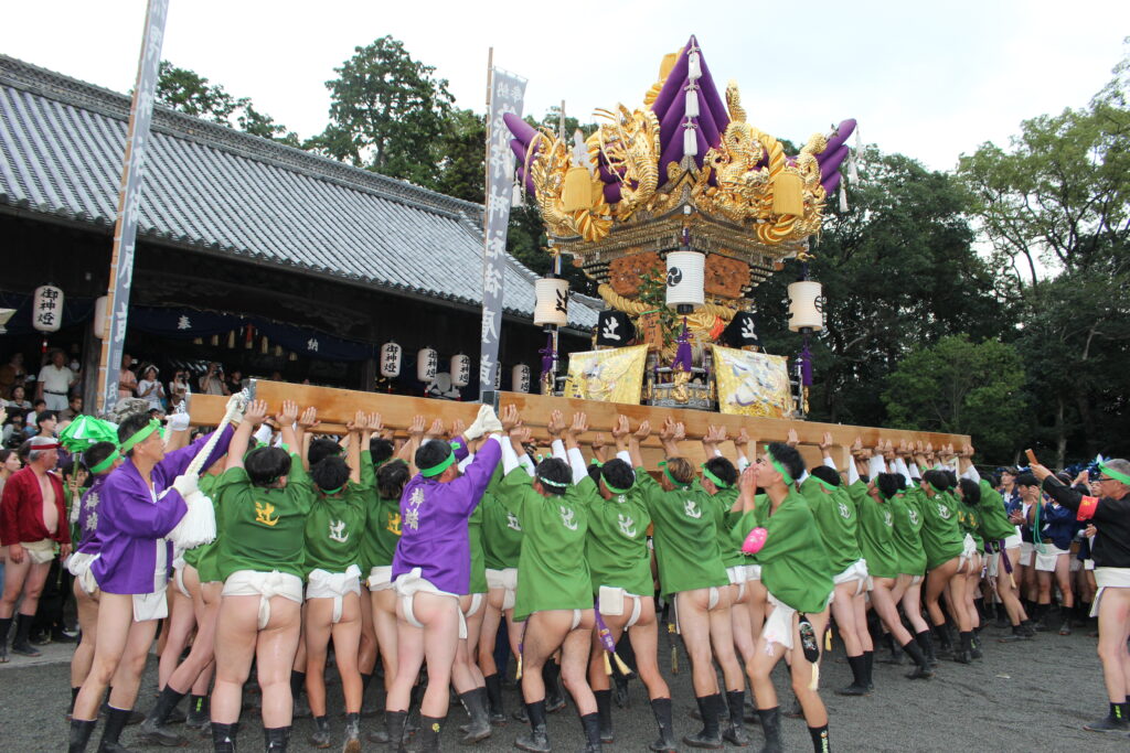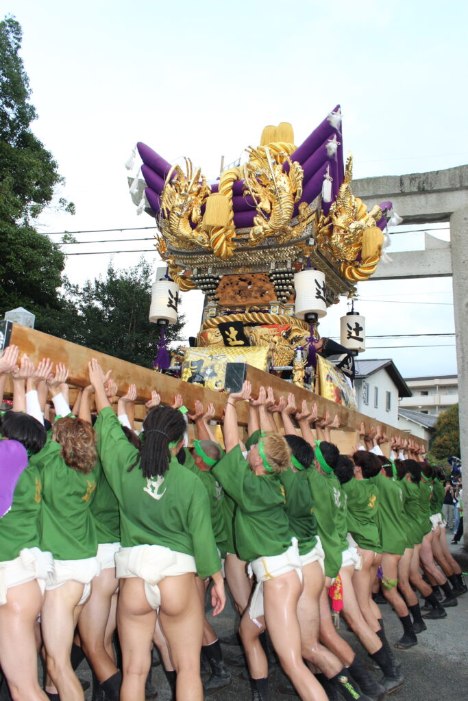 秋祭り(本宮)⑤宮出25’10.12 体育 2025.10.13 宮入りが早かったので、宮出は3番目のグループです。18時を過ぎた頃から井ノ口、辻川、大門、田尻と宮前へ動き出し、4台錬りを行いました。粘り強い担ぎ方ができました。 ▲井ノ口、辻川、大門、田尻と4台錬り中です!! ▲4台錬りの後、宮前へ移動し、差し上げました!! ▲鳥居前で、最後の差し上げです!!